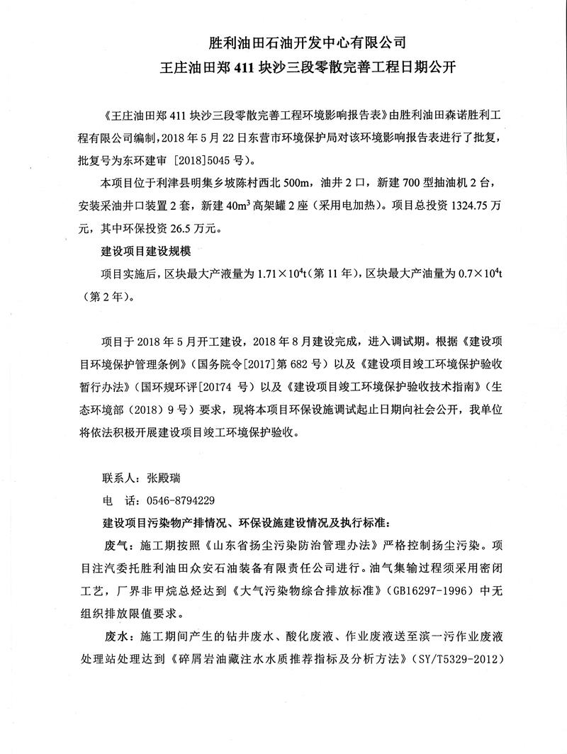 勝利油田石油開(kāi)發(fā)中心有限公司王莊油田411塊沙三段零散完善工程日期公開(kāi)