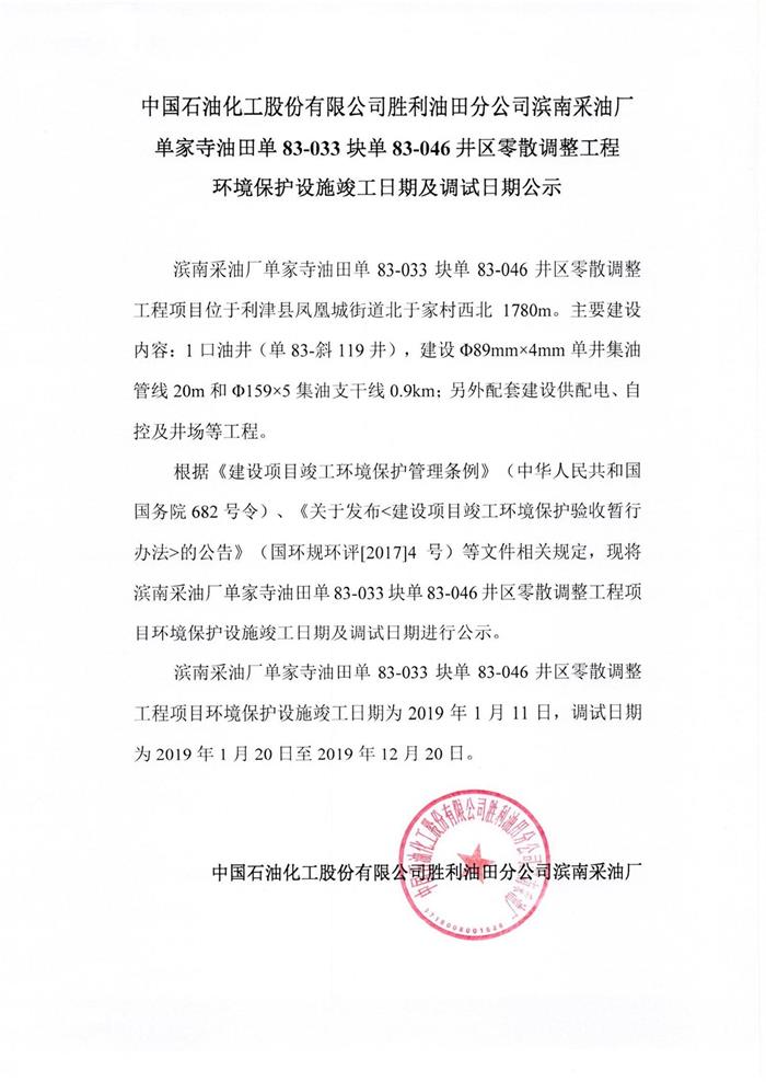 中國(guó)石油化工股份有限公司勝利油田分公司濱南采油廠單家寺油田單83-033塊83-046井區(qū)零散調(diào)整工程環(huán)境保護(hù)設(shè)施竣工日期及調(diào)試日期公示