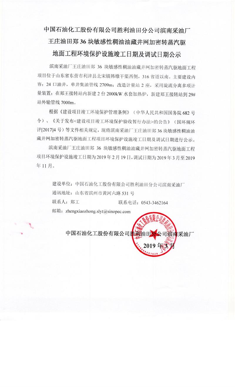 中國石油化工股份有限公司勝利油田分公司濱南采油廠王莊油田鄭36塊敏感性稠油油藏井網(wǎng)加密轉(zhuǎn)蒸汽驅(qū)地面工程環(huán)境保護設(shè)施竣工日期及調(diào)試日期公示