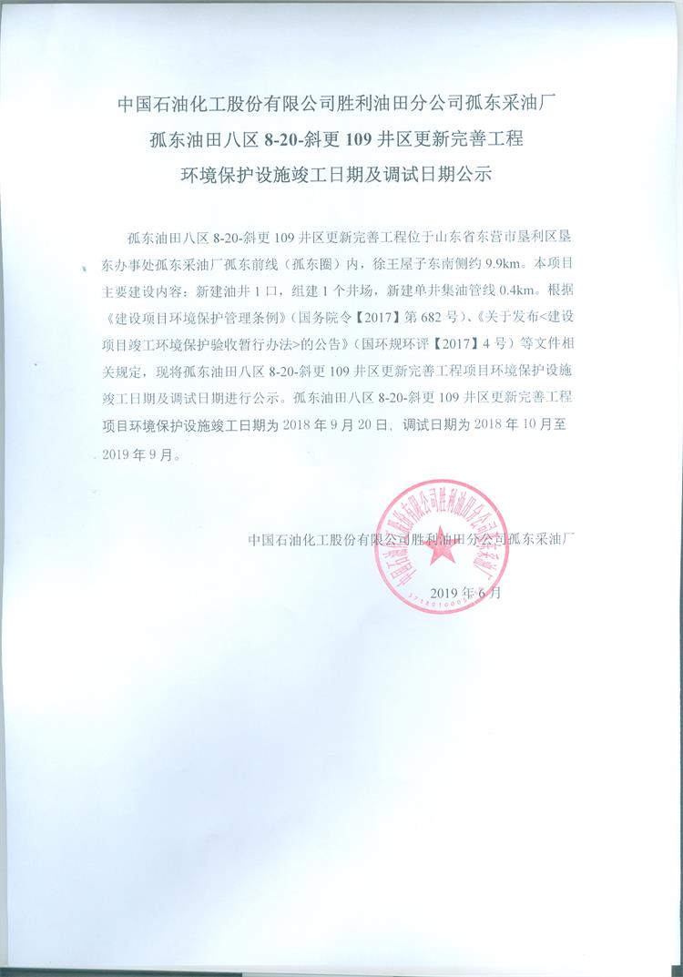 中國石油化工股份有限公司勝利油田分公司孤東采油廠孤東油田八區(qū)8-20-斜更109井區(qū)完善工程環(huán)境保護(hù)設(shè)施竣工日期及調(diào)試日期公示