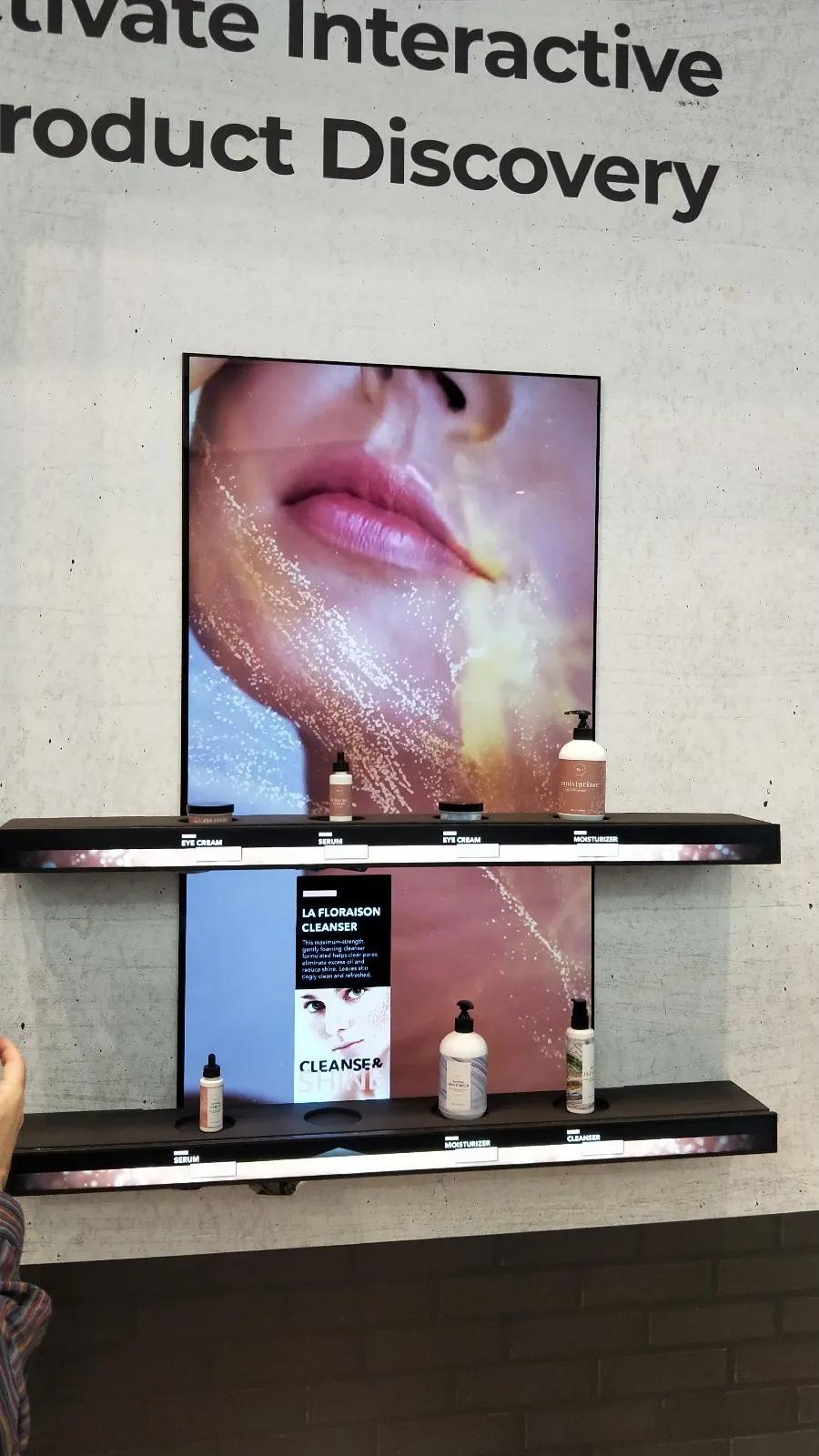 在它的旁邊是一款智能貨架,兩個層板上的產(chǎn)品均可以顯示價格,同時當(dāng)產(chǎn)品位置發(fā)生變換的時候,價格也跟著調(diào)整。背面是一整塊大屏幕,閑時播放產(chǎn)品廣告遠(yuǎn)距離傳播,當(dāng)有產(chǎn)品被拿取的時候大屏幕會以畫中畫的形式展示所拿取商品的信息。