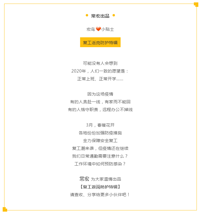首頁> 關于我們> 公司新聞> 【宏鳥小貼士】復工進行中,返崗防護特輯請查收!